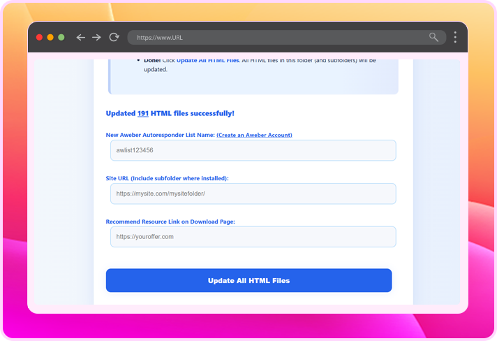 Your command center. Add your autoresponder code once—updates all 96 squeeze pages automatically. Track performance. Activate/deactivate funnels. Update links. Manage everything from one clean dashboard. (Available when using the mini-site installation.)